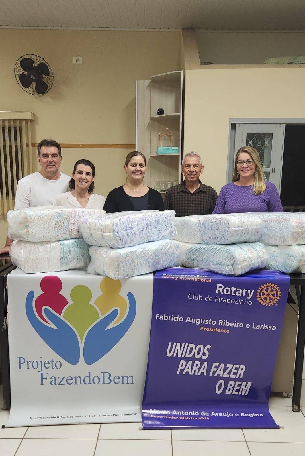 🤝 O Rotary Club de Pirapozinho realizou a entrega de mais de 1.500 fraldas descartáveis ao Projeto Fazendo o Bem, iniciativa que conta com a colaboração ativa do clube e utiliza máquina doada pelo próprio Rotary para a confecção das fraldas.